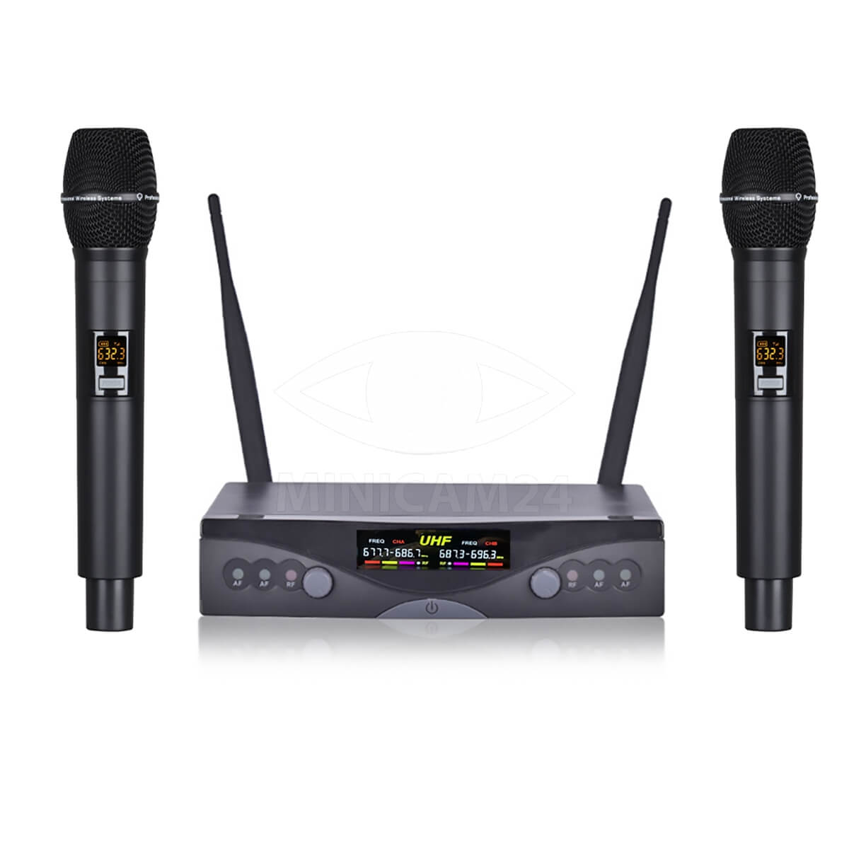 Комплектация системы включает радиоприемник, два микрофона UHF, провод, USB кабель, кабель радиоприемника, два держателя микрофона, две ветрозащитные насадки для микрофона и две батарейки.